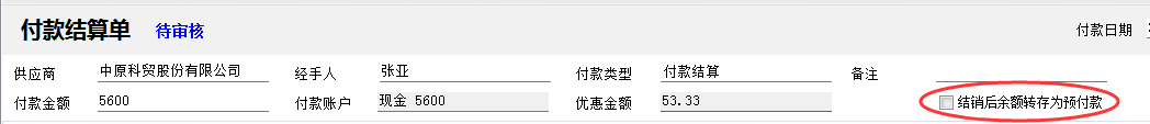 ????部分情況下,我們付款結銷此前的應付款,可能會多付一部分,這部分可以打勾選擇“結銷余額轉為預付款”復選框,軟件會自動生成相應的付款結算單(其付款類型為“采購預付款”,金額為結余部分)。