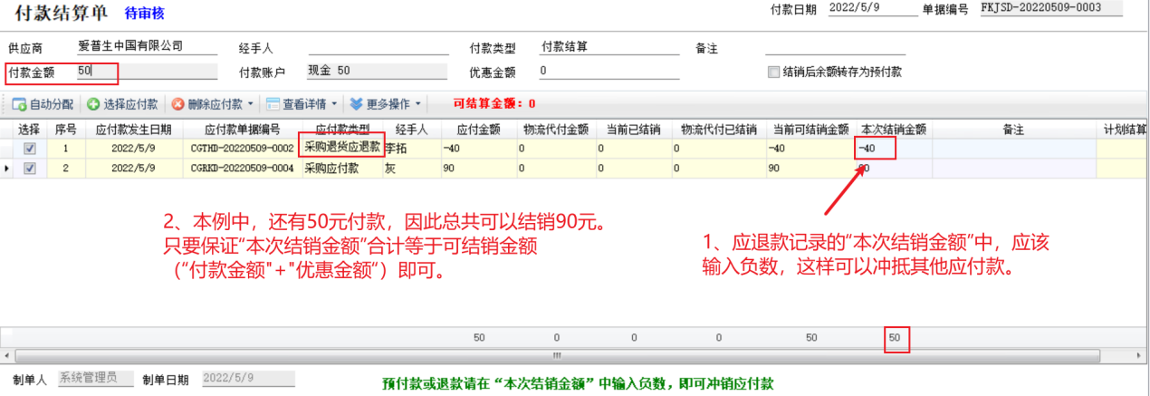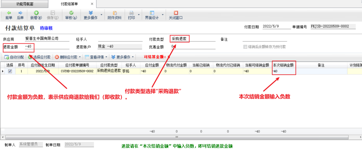 ????② 應退款記錄的“本次結銷金額”需要輸入負數,這樣可以沖抵其他應付款記錄(正負可以抵銷)。使用應退款沖銷應付款,可以不錄入本次付款金額(即沒有新付款),這樣可沖抵的金額即為應退款的金額。