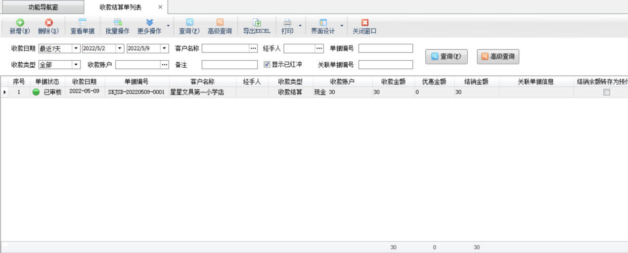 紅沖單據(作廢單據):在工具欄點擊“更多操作”—》“紅沖(作廢單據)”可以紅沖/作廢已審核的收款結算單。