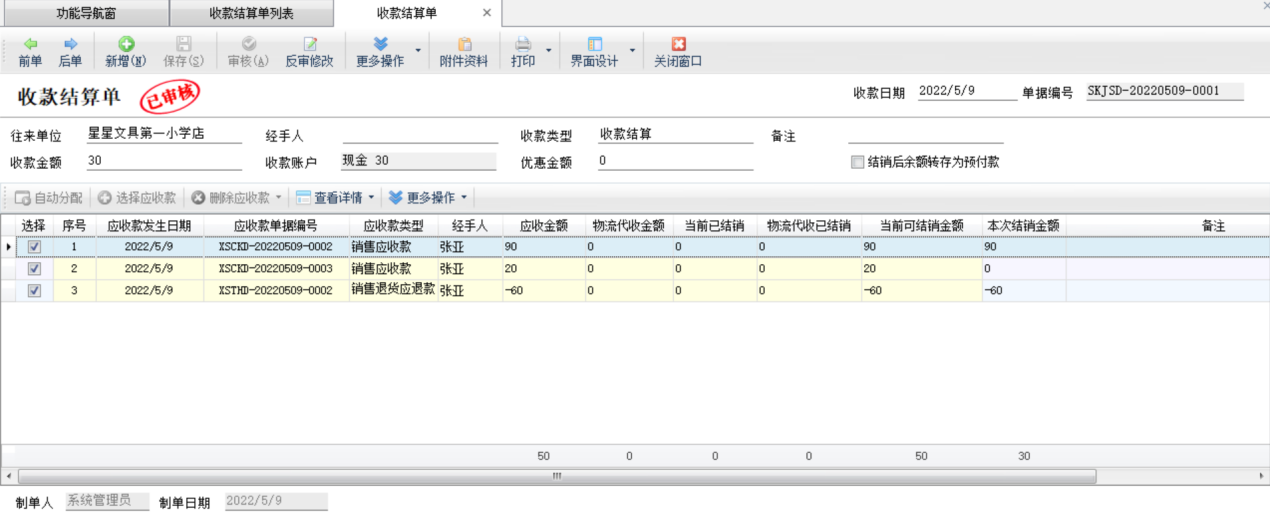 ????收款結算:在工具欄點擊“收款結算”—》“收款結算”可以對單據進行收款結算。