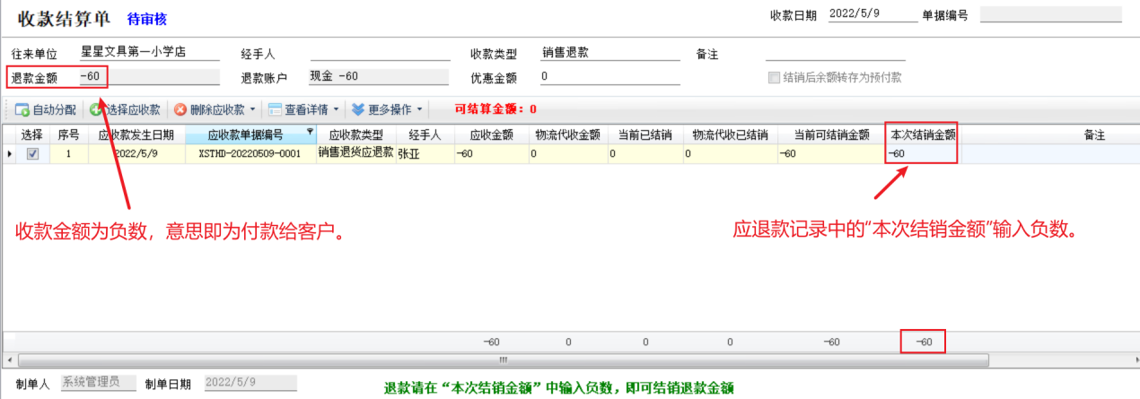 ????② 銷售應退款記錄的“本次結銷金額”需要輸入負數,這樣可以沖抵其他應收款記錄(正負可以抵銷)。使用應退款沖銷應收款,如果沒有收到新款項,可以不錄入本次收款金額,這樣可沖抵的金額即為應退款的金額(本次結銷金額的合計為 0)。
