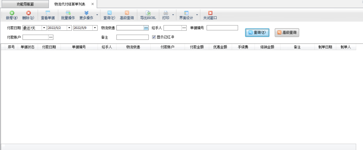 ????物流代付結算:在工具欄點擊“付款結算”—》“物流代付結算”可以對物流代付的單據進行付款結算。