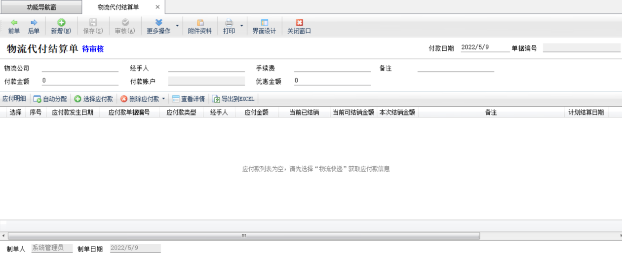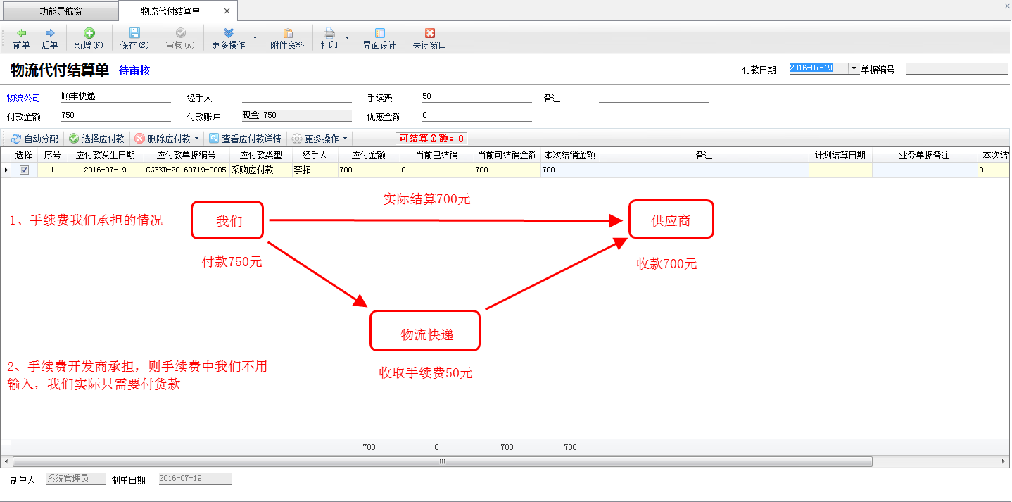 ????物流代付結算單的操作與付款結算單基本一致,這里不再詳述。