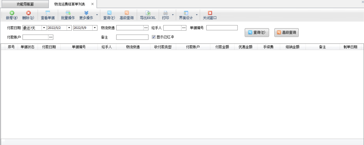查詢:可以根據付款日期、物流快遞、經手人、單據編號、付款賬戶、備注內容等信息查詢結算單。