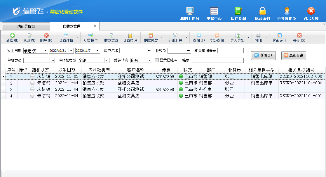 查詢:可以根據收款日期、客戶名稱、經手人、單據編號、收款類型、收款賬戶、備注內容、關聯業務單據等信息查詢結算單。