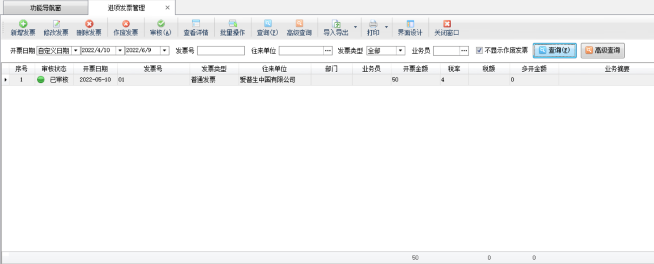 查詢:可以根據開票日期、發票號、往來單位、發票類型、業務員等信息查詢進項發票。