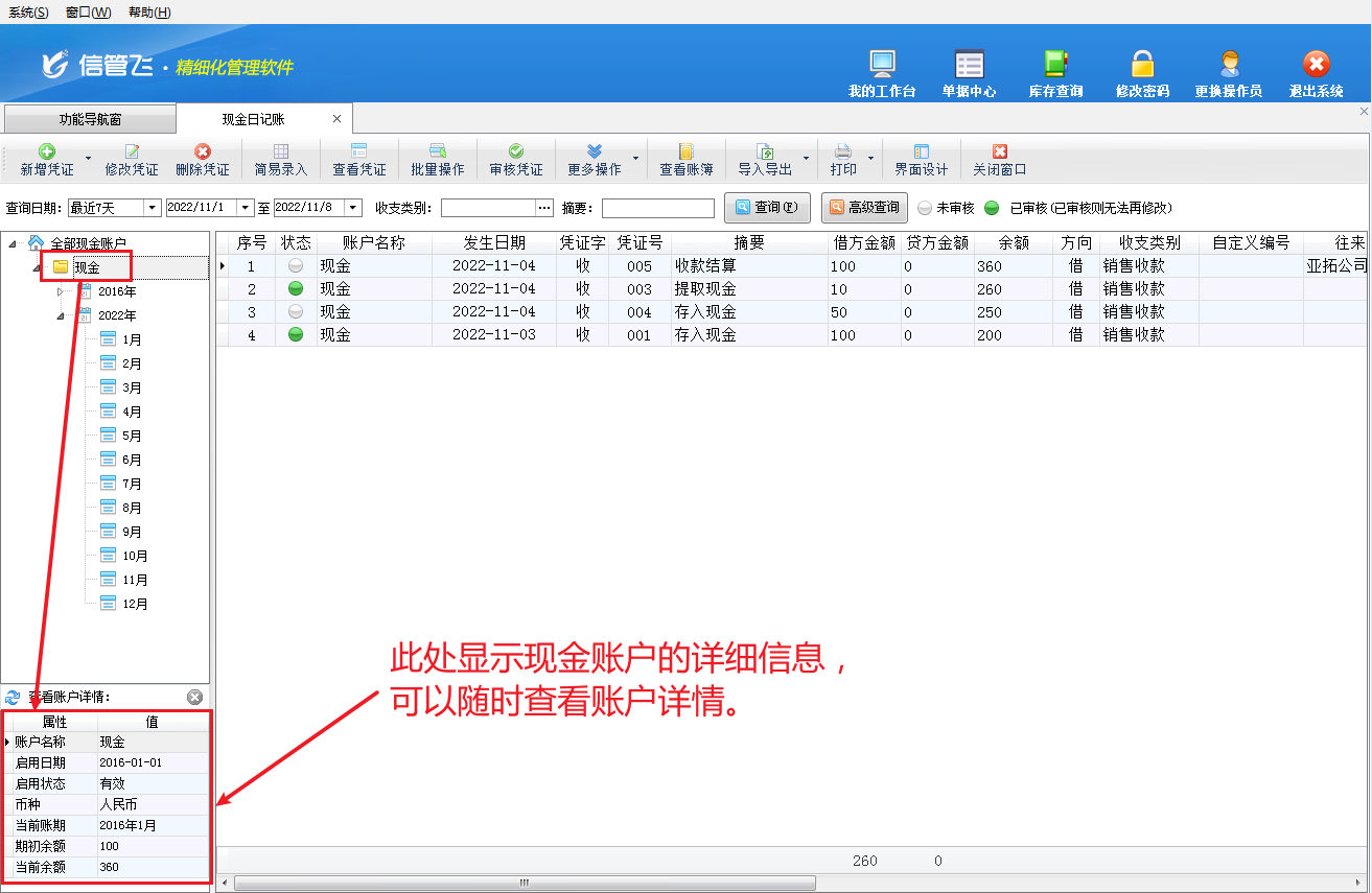 ????點擊工具欄中的“查看詳情”按鈕,可查看統計結果中的任一日記賬明細。