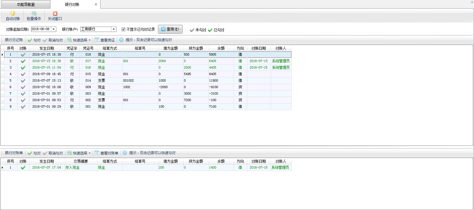 1 | 自動對賬 | 點擊工具欄中的“自動對賬”按鈕,系統會彈出“自動對賬”窗口,設置對賬起始日期及對賬選項后點擊“開始勾對”即可,詳細操作見下文描述。 |