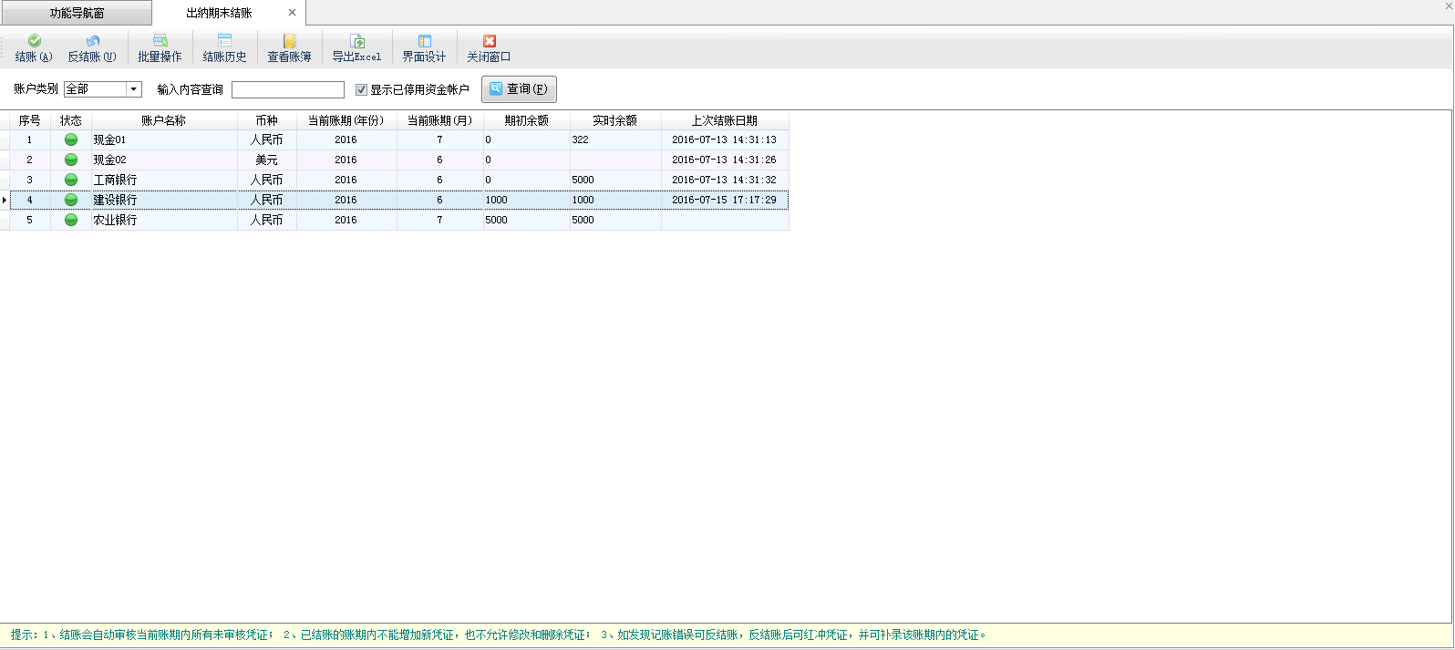 2 | 批量操作 | 在帳戶列表中,點擊工具欄中的“批量操作”按鈕可以進入批量操作模式,可以對多個資金賬戶進行批量結賬、批量反結賬操作。 |
