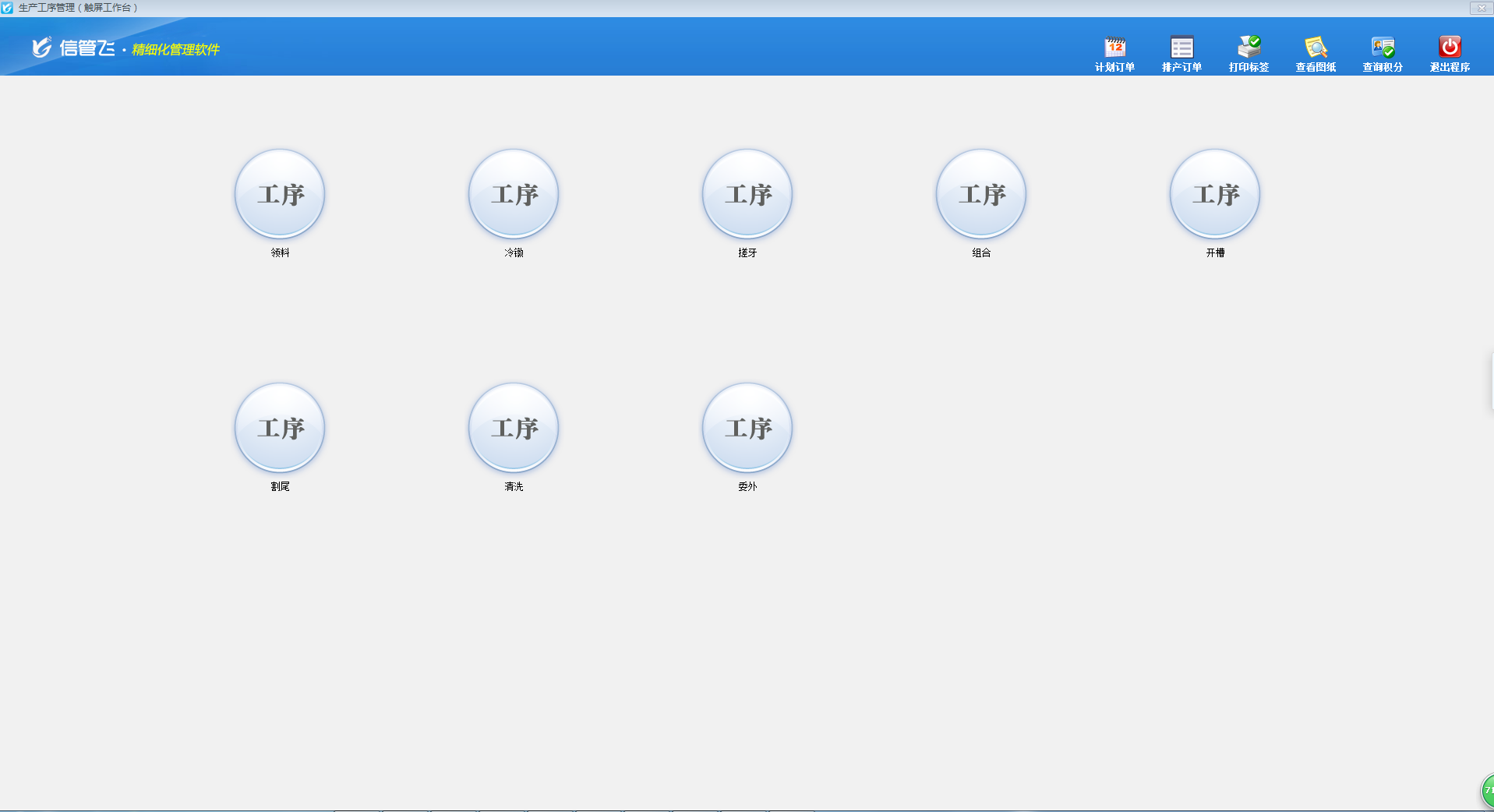 ????在功能導(dǎo)航窗點(diǎn)擊“生產(chǎn)管理”—》“生產(chǎn)工序管理”,即可進(jìn)入生產(chǎn)工序管理(觸屏工作臺(tái))界面(如下圖所示),此觸屏工作臺(tái)界面可操作的工序請(qǐng)?jiān)诠δ軐?dǎo)航窗點(diǎn)擊“績(jī)效考核”—》“績(jī)效考核項(xiàng)目”中進(jìn)行設(shè)置。