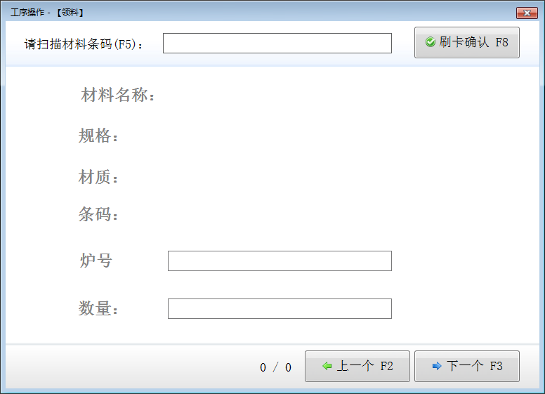 領(lǐng)料操作:點(diǎn)擊“工序(領(lǐng)料)”可以打開(kāi)領(lǐng)料操作窗口,請(qǐng)掃描或者輸入原材料條碼選擇原材料,輸入領(lǐng)料數(shù)量并刷卡確認(rèn)領(lǐng)料。