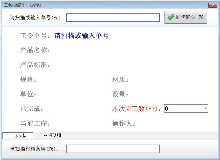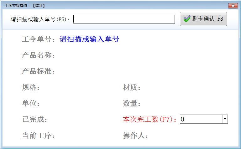 工序交接操作:冷鐓、搓牙、組合、開(kāi)槽、割尾、清洗、委外為工序交接操作,操作人員選擇相應(yīng)工序可以打開(kāi)此工序交接操作窗口,請(qǐng)掃描或輸入工令單單號(hào)選擇工令單,輸入本次完工數(shù)量后進(jìn)行刷卡確認(rèn)工序交接,如圖所示。