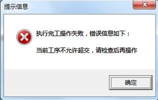 ????如當(dāng)前工序設(shè)置不允許超交 ,則“完工數(shù)量”不能大于“計(jì)劃數(shù)量”,如果輸入的“完工數(shù)量”大于“計(jì)劃完成數(shù)量”,系統(tǒng)會(huì)彈出提示信息:“執(zhí)行完工操作失敗,當(dāng)前工序不允許超交,請(qǐng)檢查后再操作”。