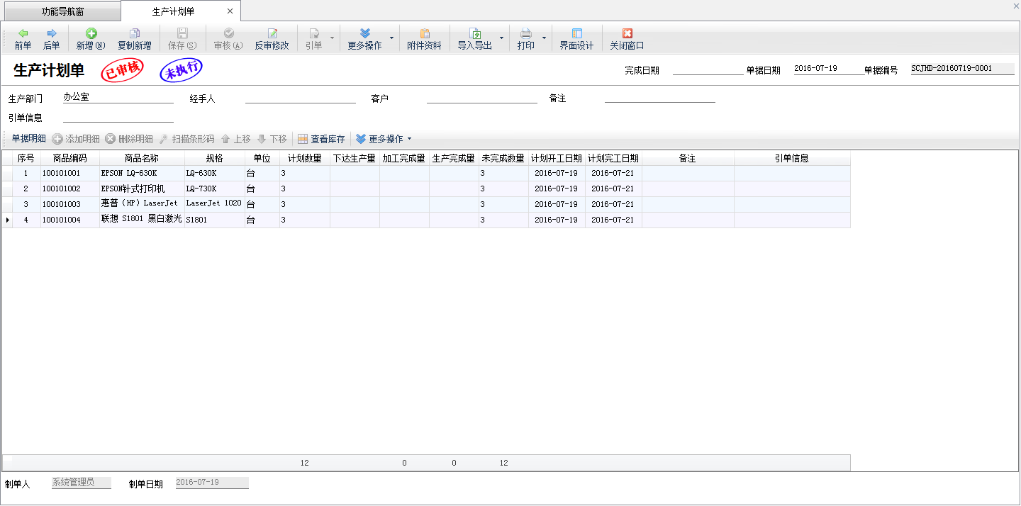 ????(1)未執(zhí)行:新增加的生產(chǎn)計(jì)劃單,處于“未執(zhí)行”狀態(tài)。