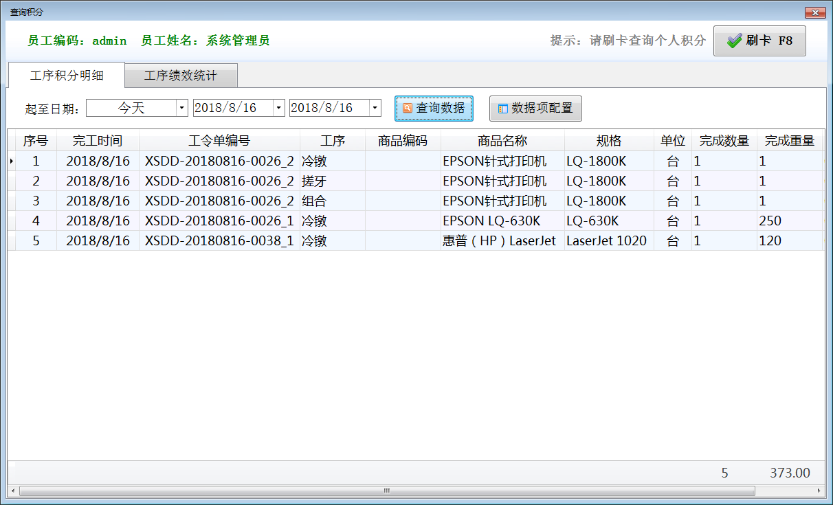 查詢積分:點(diǎn)擊“查詢積分”按鈕可以打開(kāi)查詢積分窗口,請(qǐng)刷卡查詢個(gè)人積分,可以根據(jù)日期范圍查詢個(gè)人工序積分明細(xì)及工序績(jī)效統(tǒng)計(jì)積分。