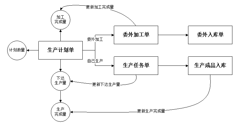 ????② 生產(chǎn)計(jì)劃明細(xì)中只能輸入計(jì)劃數(shù)量(即計(jì)劃生產(chǎn)數(shù)量),其他數(shù)量由后續(xù)單據(jù)執(zhí)行后自動(dòng)更新。下圖為不同業(yè)務(wù)單據(jù)更新相應(yīng)數(shù)量示意圖: