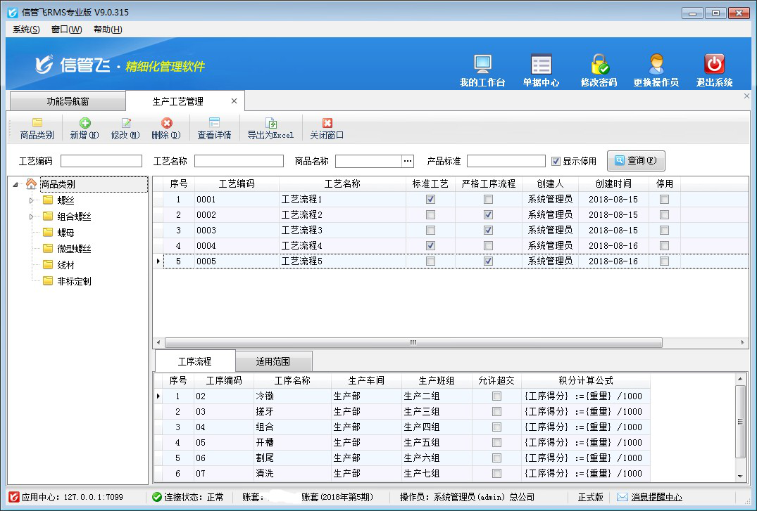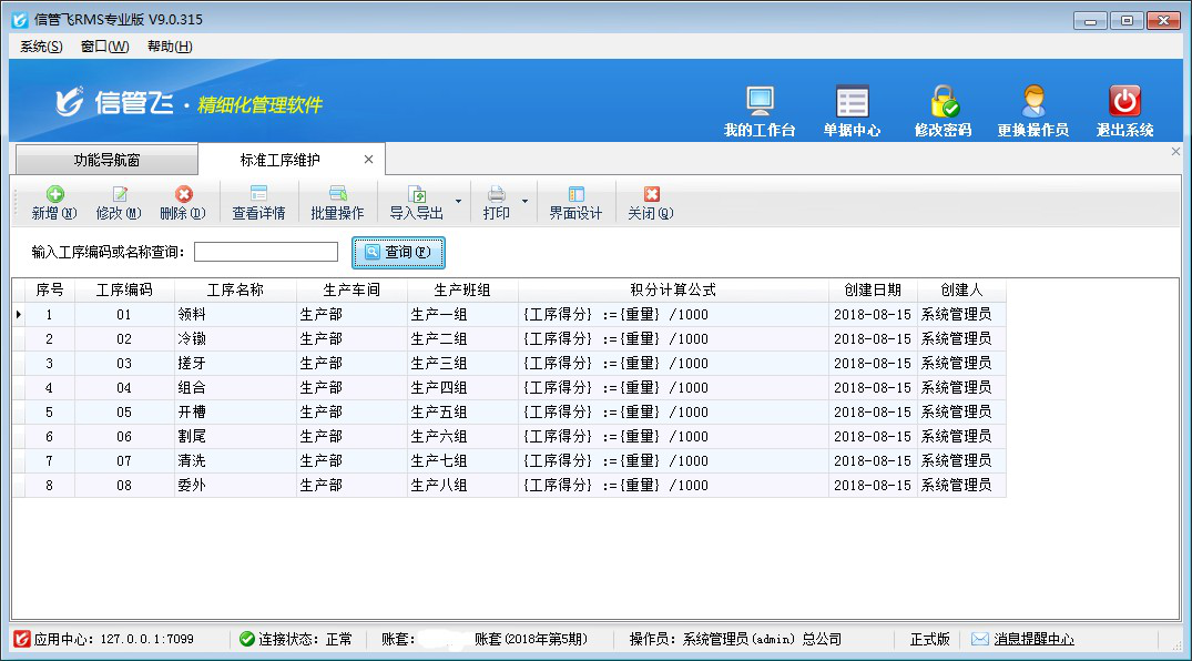 ????生產(chǎn)工序管理用于管理整個(gè)生產(chǎn)過(guò)程中各工段加工產(chǎn)品的次序,材料經(jīng)過(guò)各道工序,最終加工成成品。通過(guò)對(duì)整個(gè)生產(chǎn)活動(dòng)的分階段進(jìn)行管理,使各階段銜接的良好有序,從而可以能提高產(chǎn)品質(zhì)量和勞動(dòng)生產(chǎn)率。