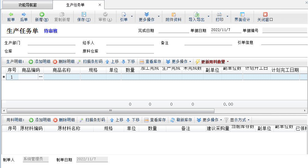 單據(jù)明細(xì):引用或輸入生產(chǎn)商品明細(xì)后,只需要錄入“數(shù)量”,其他數(shù)量由后續(xù)業(yè)務(wù)單據(jù)引用生成任務(wù)單后,自動(dòng)更新。
