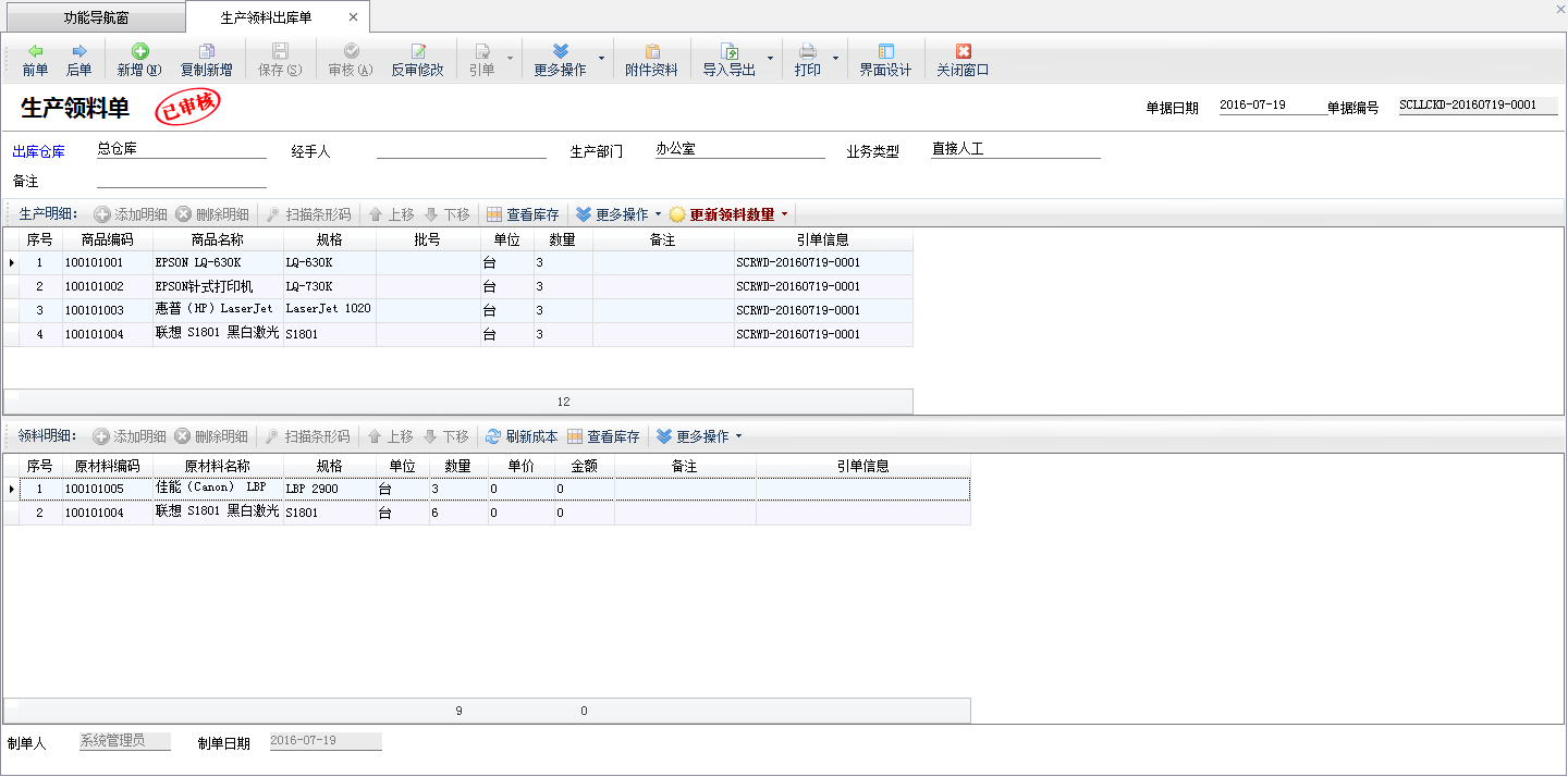 ????生產(chǎn)領(lǐng)料出庫(kù)操作說(shuō)明和生產(chǎn)任務(wù)單一致,這里不再詳細(xì)介紹。