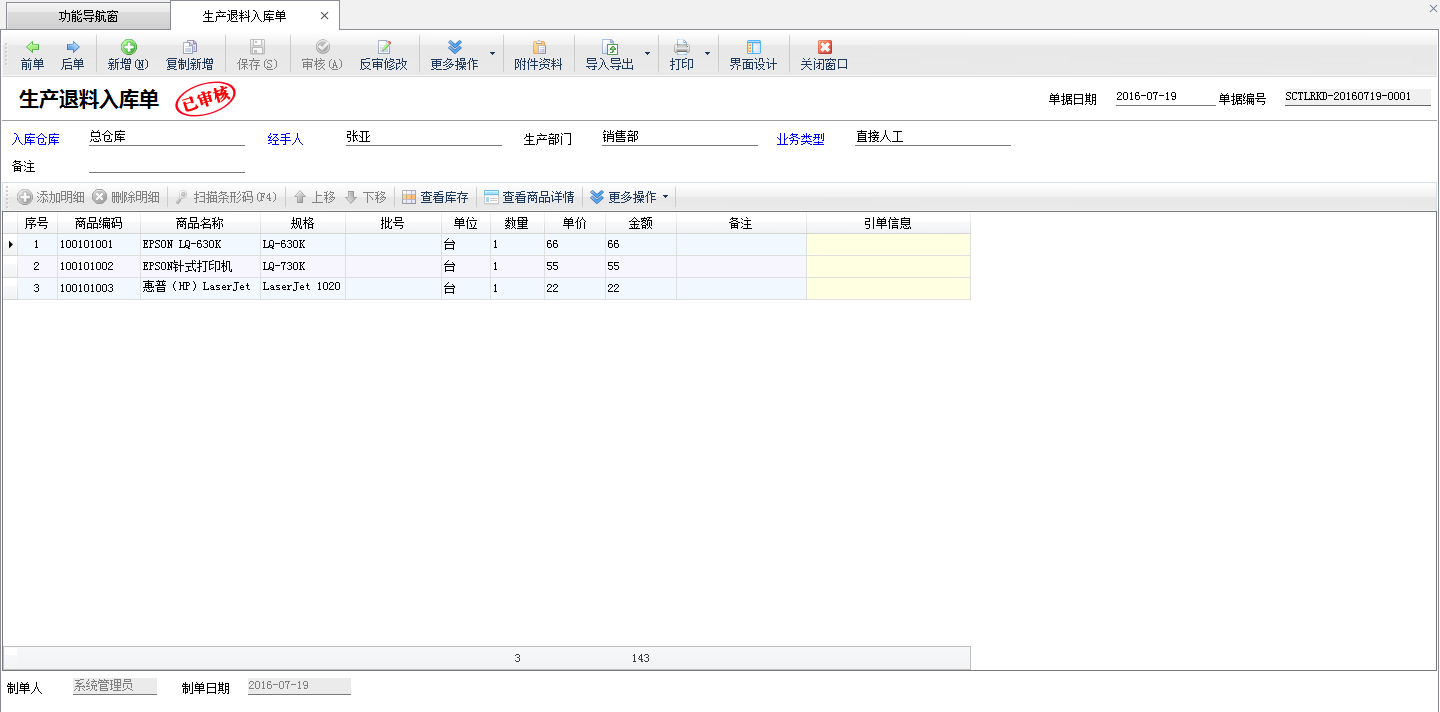 ????生產(chǎn)退料入庫(kù)單操作比較簡(jiǎn)單,這里不再詳述。
