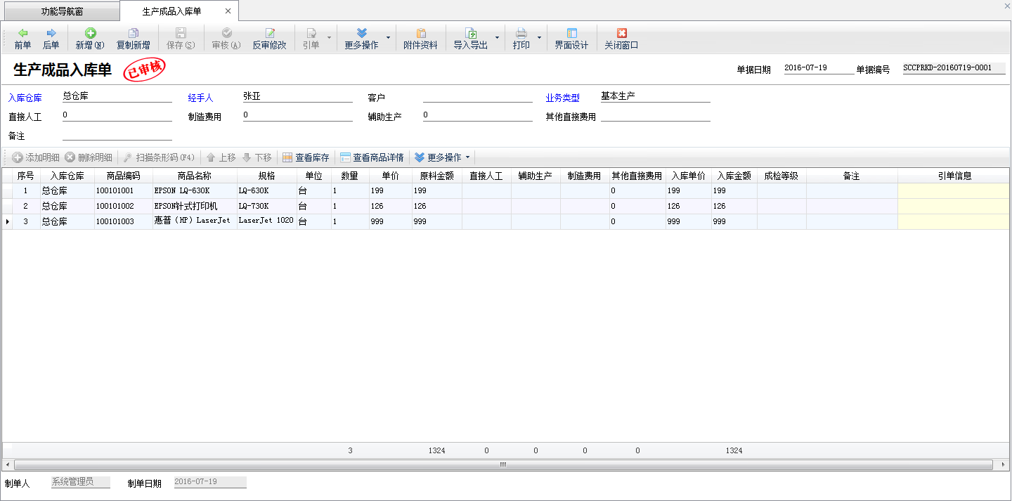 # 3.8.5 生產(chǎn)成品入庫(kù)單