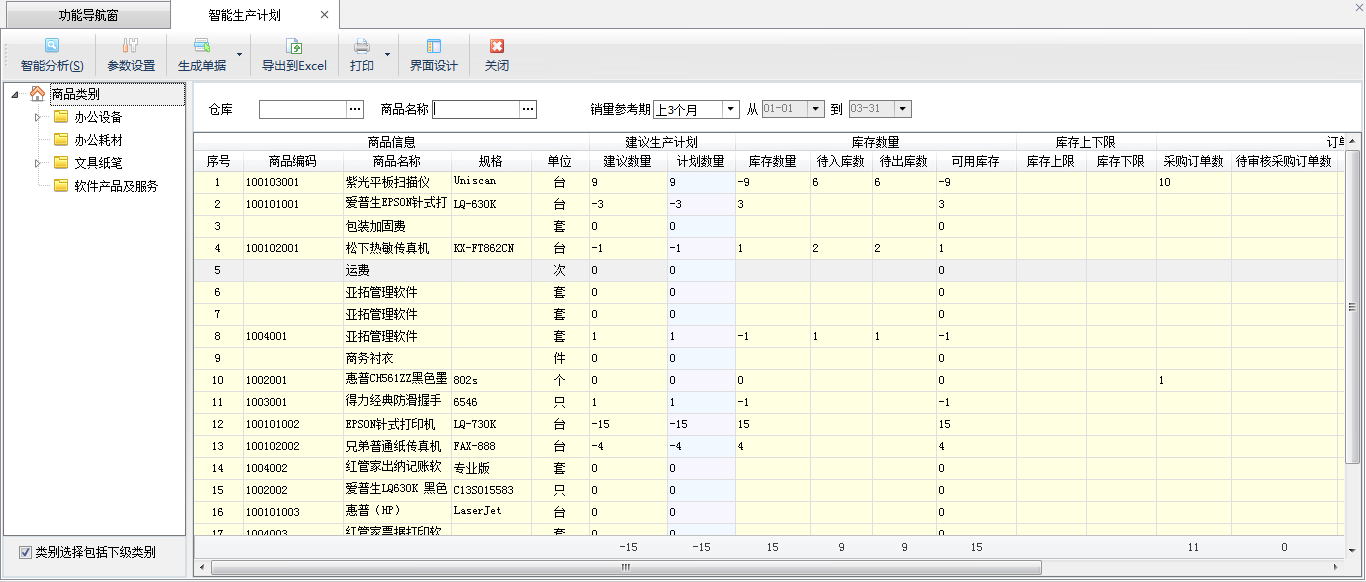 ????智能生產(chǎn)計(jì)劃可根據(jù)當(dāng)前庫(kù)存情況,并可結(jié)合庫(kù)存上下限、往年同期銷售量、銷售訂單數(shù)量、待審核數(shù)量等條件進(jìn)行組合運(yùn)算,從而給出建議的商品生產(chǎn)建議數(shù)量,并可以把建議結(jié)果生成為生產(chǎn)計(jì)劃單。