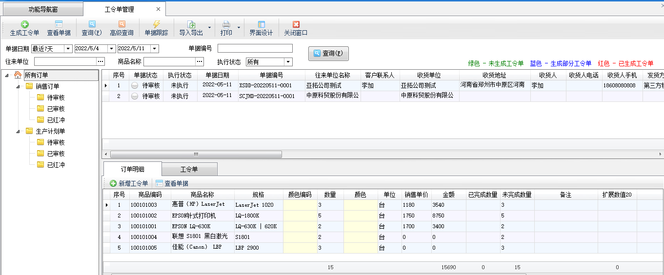 ????在功能導(dǎo)航窗點(diǎn)“生產(chǎn)管理”—》“工令單管理”即可進(jìn)入“工令單管理”界面。工令單管理以列表的形式顯示最近的銷售訂單,可以查看訂單明細(xì)及訂單對(duì)應(yīng)的工令單信息。