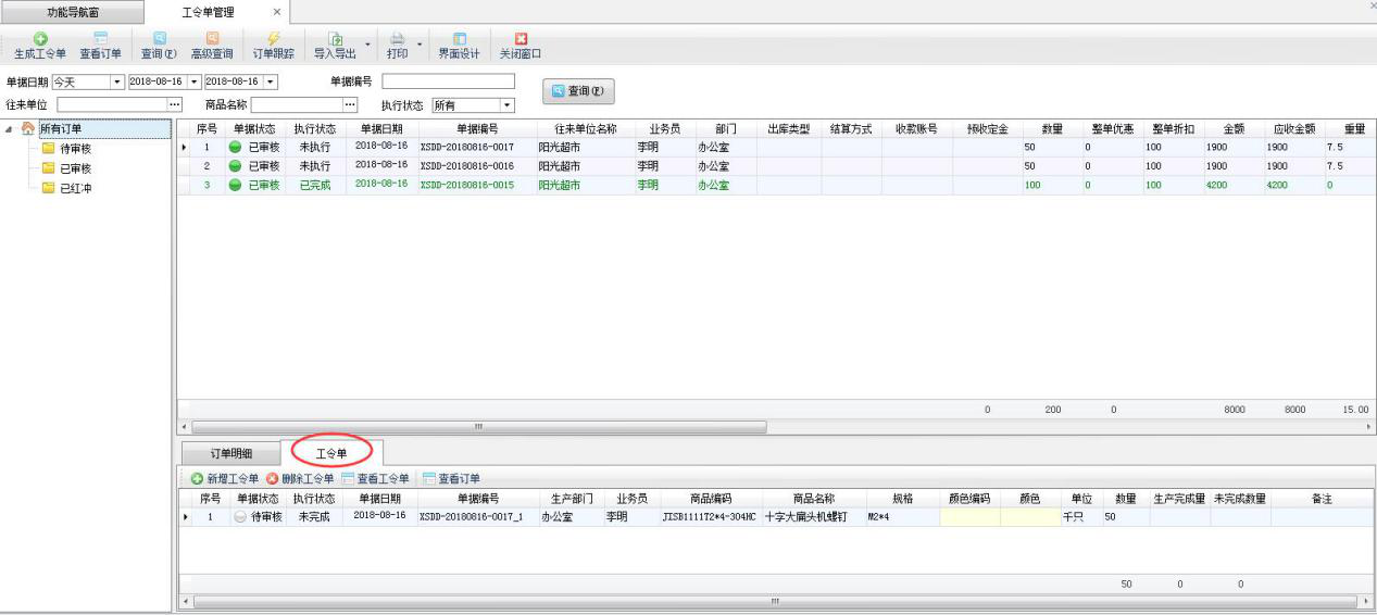 生成工令單:在工具欄點(diǎn)擊“生成工令單”按鈕可以根據(jù)已審核銷售訂單生成工令單。