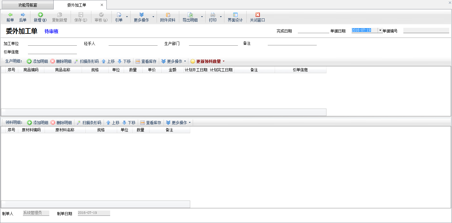 引單:委外領料單可以引用“委外加工單”,并將加工單中的產品明細作為單據的生產明細,同時如果相應的商品有生產模板則自動根據生產模板生成領料明細。