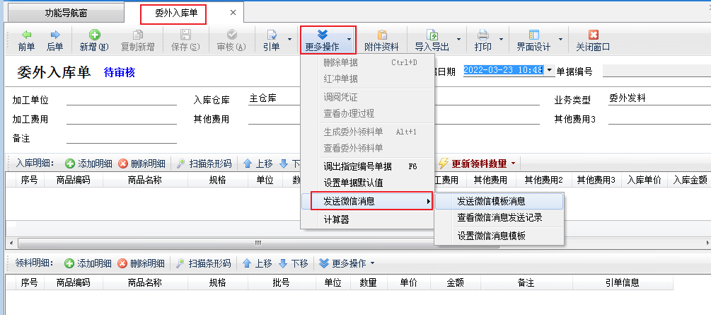 ????委外加工如果需要我們提供原材料,則可以開“委外領料單”進行原材料出庫。委外領料單包括生產產品明細和領料明細兩部分,支持根據“生產模板”自動生成需要的原材料明細。生產明細中的商品并不影響倉庫庫存,領料明細中的原材料將會出庫。