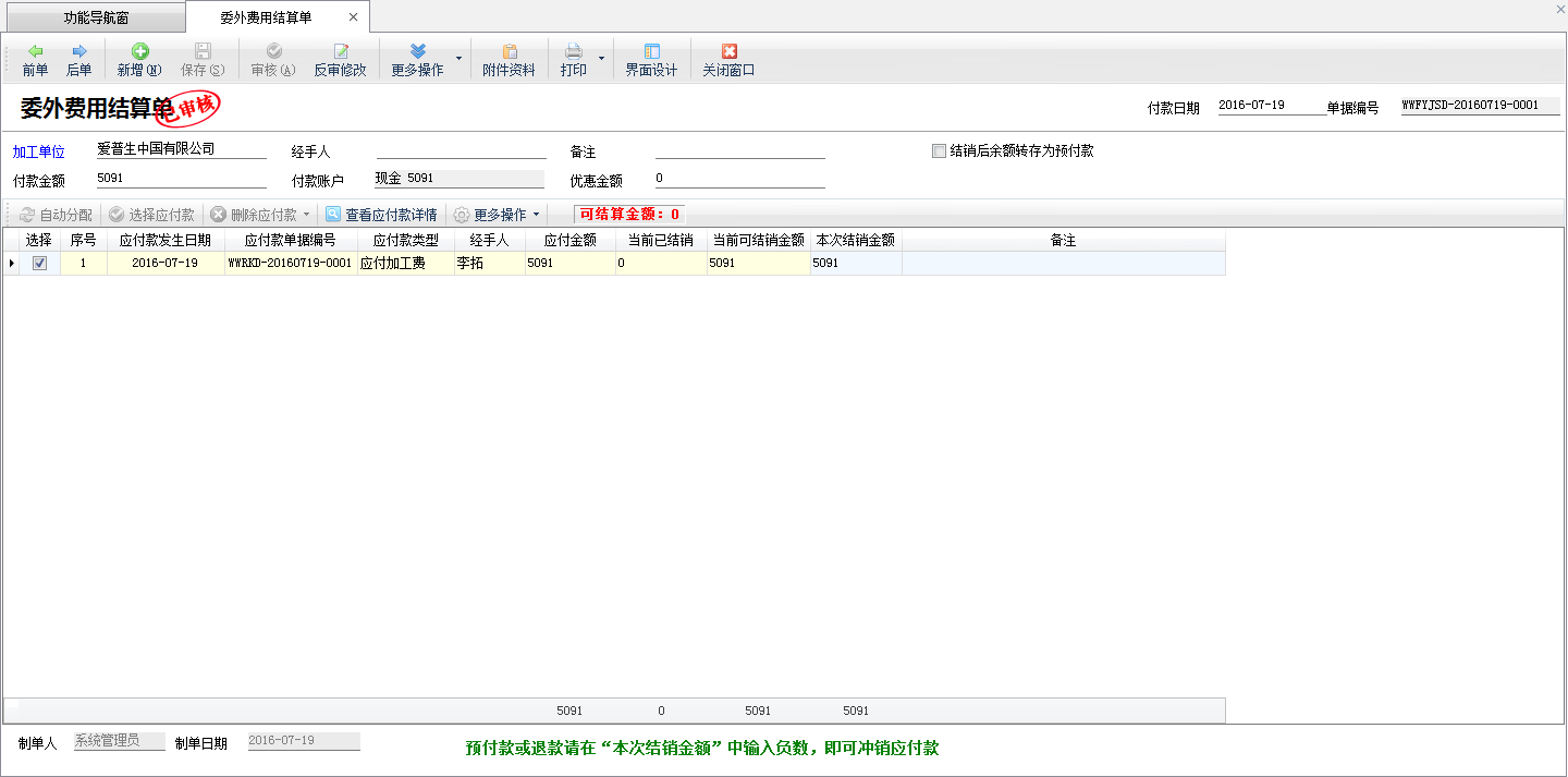 ????委外費用結算可實現與加工單位的費用結算核銷,與付款結算單功能基本一致。選擇加工單位后,軟件會自動顯示出該加工單位對應的應付款(即委外費用單中登記的費用),然后按單進行核銷即可。