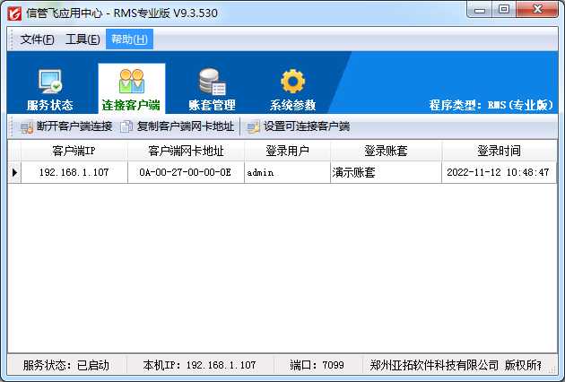 ????可以管理已連接到主機的客戶端電腦信息,包括客戶端IP、客戶端網卡地址、登錄操作員、登錄賬套以及登錄時間。