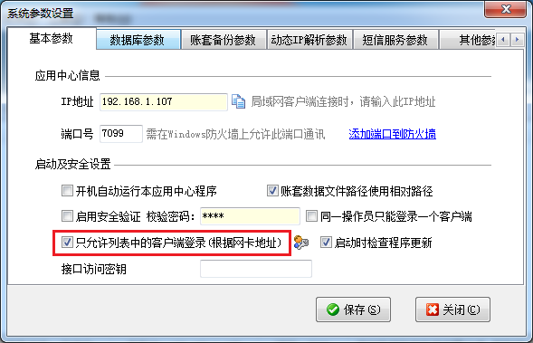 ????點“設置可連接客戶端”按鈕,可以設置允許哪些客戶端電腦登錄。使用這個功能需要先在“系統參數設置”中復選“只允許列表中的客戶端登錄”。