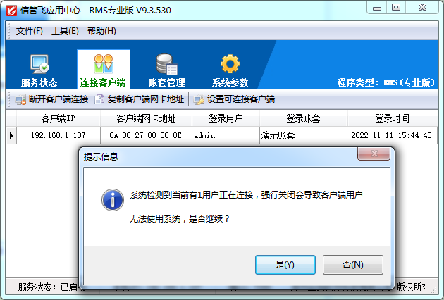 ????點“斷開客戶端連接”按鈕,可以斷開選擇的客戶端連接,對應的客戶端自動下線,無法使用軟件。