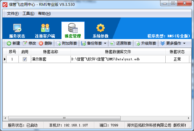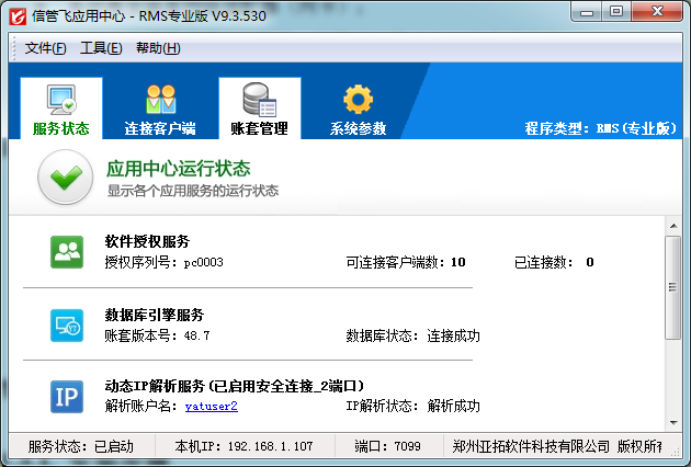 ????應用中心程序是軟件的管理控制中心,集中管理連接客戶端和賬套數據庫,從而實現數據的集中存儲和實時共享。應用中心主要包括運行狀態管理、連接客戶端管理、賬套管理、系統參數配置等功能。