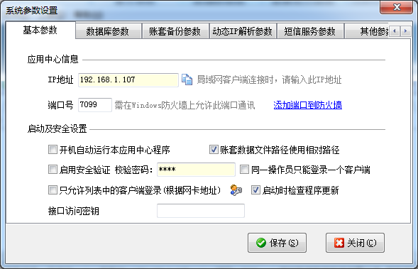 ????系統參數設置主要包括基本參數、數據庫參數、賬套備份參數、動態 IP 解析參數、短信服務參數、其他參數等。