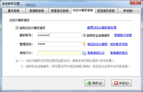 ????解析帳號的密碼分為管理密碼和使用口令。客戶端程序登錄的時候只需要知道使用口令即可。管理密碼在系統參數配置中使用,由系統管理員掌握即可。