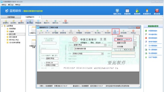 ????我們以支票打印為例,先填開一個(gè)支票單據(jù),保存支票單據(jù)。然后點(diǎn)擊“打印”—》“直接打印”,如圖1所示。