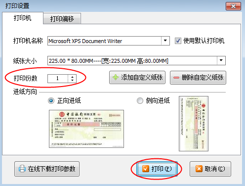 ????系統(tǒng)彈出“打印設(shè)置”窗口,“打印份數(shù)”默認(rèn)為“1”,如果需要打印多份,可以輸入需要打印的份數(shù),然后點(diǎn)擊“打印”按鈕進(jìn)行打印即可,如圖2所示。