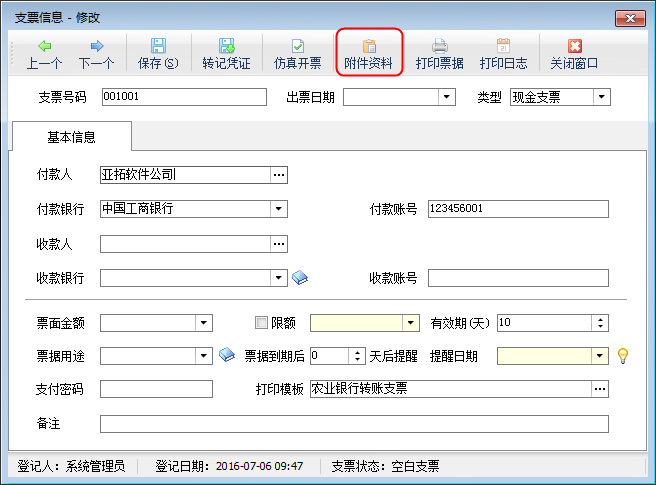 ????支票管理功能主要包括登記支票、修改支票、刪除支票、查看支票詳情、導(dǎo)入導(dǎo)出支票數(shù)據(jù)、打印支票、刷新支票列表。