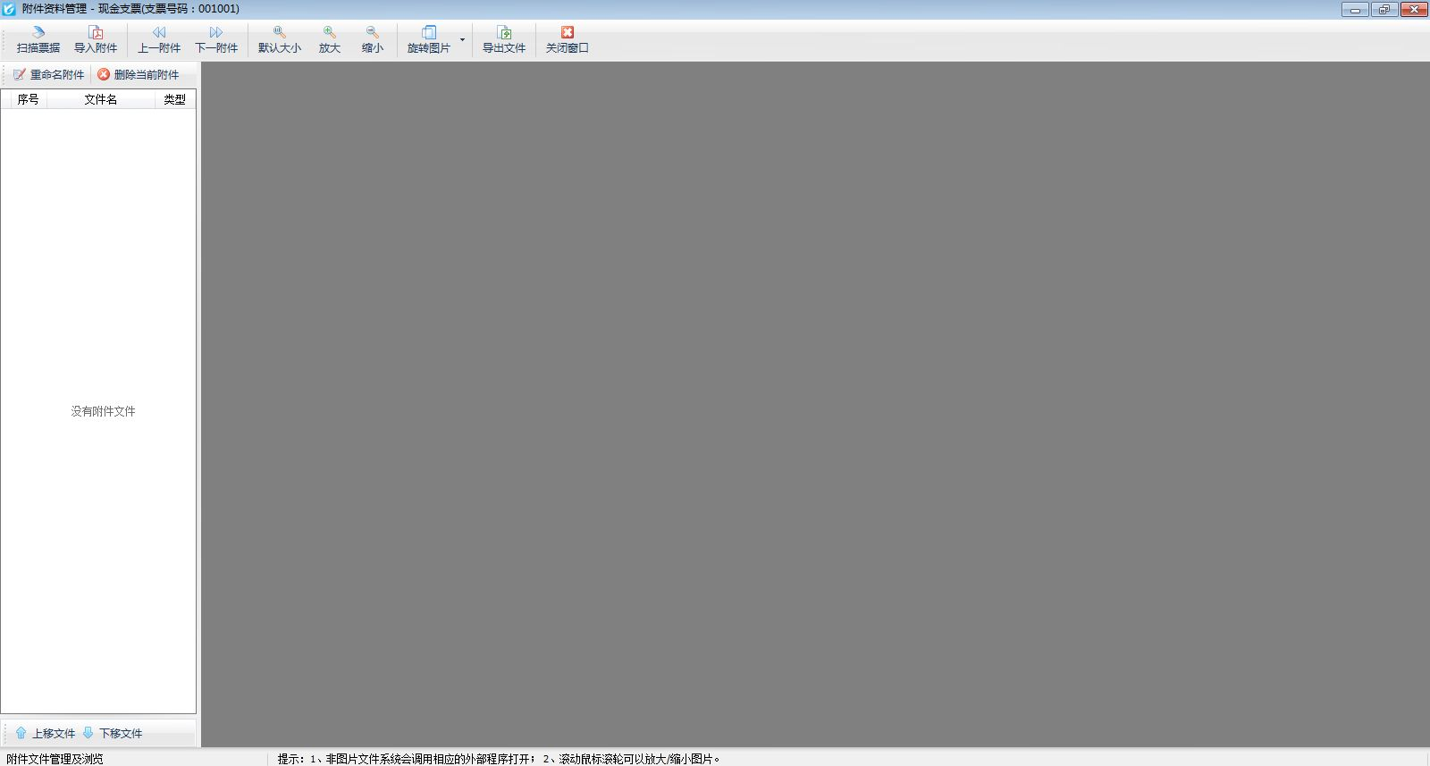 ????在填開或者修改票據(jù)的界面,如圖1所示,點(diǎn)擊工具欄中的“附件資料”按鈕,可以進(jìn)入“附件資料管理”界面,如圖2所示,可掃描或?qū)肱c票據(jù)相關(guān)的電子文件。