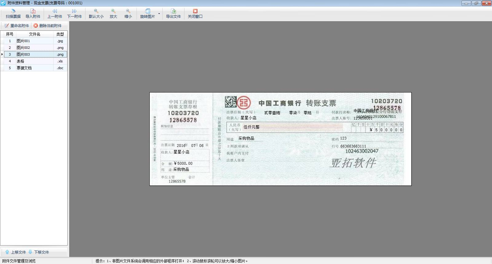 ????紅管家票據(jù)打印軟件開單后,自動(dòng)保存數(shù)據(jù),方便以后查閱或打印,填開支票、承兌匯票、快遞單以及其他票據(jù)時(shí),軟件支持添加文檔、圖表等附件資料,可掃描或?qū)肱c票據(jù)相關(guān)的電子文件,方便用戶更全面、直接地查詢票據(jù)的全過程,有利于企業(yè)票據(jù)管理控制。下面我們介紹一下附件資料管理功能的使用。