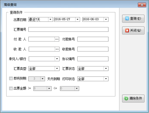 ????可以按多種輸入條件對(duì)匯票精確或模糊查詢。點(diǎn)擊工具欄中的“高級(jí)查詢”,系統(tǒng)打開“高級(jí)查詢”窗口,如下圖所示,輸入查詢條件(出票日期、匯票編號(hào)、付款人、付款賬號(hào)、收款人、收款賬號(hào)、承兌銀行、匯票類型、匯票狀態(tài)等信息)后系統(tǒng)可快速查詢到滿足條件的匯票。