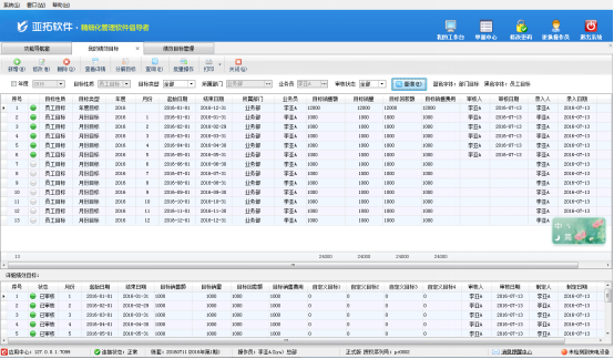 ????查詢:可以根據年度、目標性質、目標類型、部門、業務員及審核狀態等條件查詢績效目標記錄。
