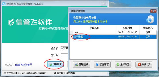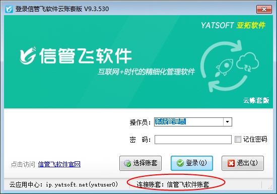 ????打開(kāi)軟件官網(wǎng)(信管飛軟件官網(wǎng)),下載對(duì)應(yīng)軟件云賬套安裝程序,然后打開(kāi)程序包安裝,安裝完成后,點(diǎn)擊選擇賬套,輸入購(gòu)買(mǎi)軟件分配的通行證賬號(hào)和密碼,下一步選擇賬套登錄。如下圖所示: