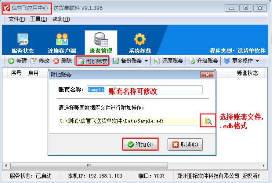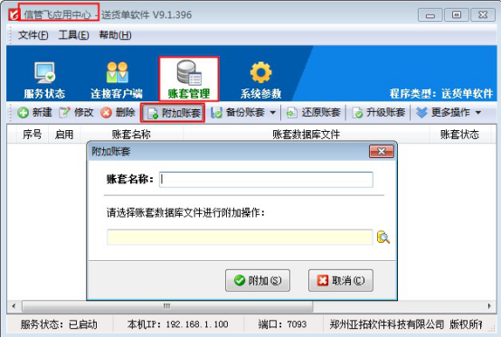 ????信管飛RMS、信管飛倉庫管理軟件、信管飛票據打印軟件、信管飛出納記賬軟件、信管飛送貨單軟件都包括客戶端程序和應用中心程序兩個模塊,客戶端程序登錄系統時,應用中心程序是必須打開的。如果主機電腦關機或關閉應用中心程序、程序出現異常等,客戶端程序與應用中心的連接就會斷開。應用中心程序再次正常運行后,客戶端程序需要重新建立與應用中心程序的連接。下面我們以信管飛送貨單軟件為例介紹一下客戶端程序重連應用中心程序的操作方法。