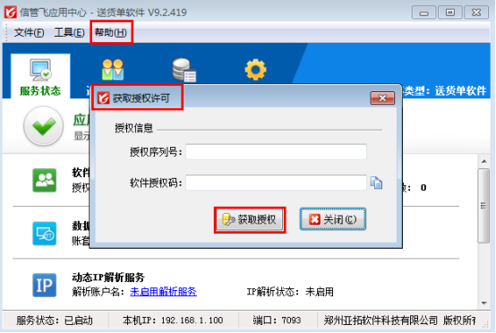 ????解決方法:請在應用中心程序中,點菜單“幫助”—》“獲取授權許可”,然后輸入購買的授權許可信息,點“獲取授權”即可。獲取授權成功后,請關閉應用中心程序,重新運行應用中心程序即可!如下圖所示: