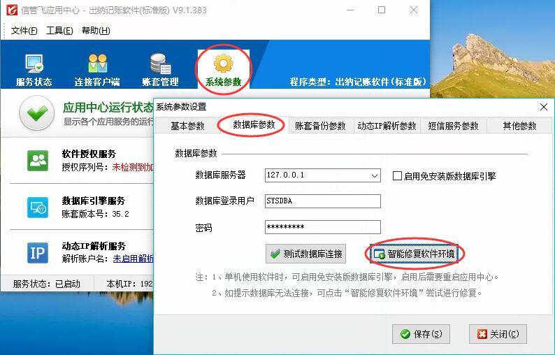 ????軟件默認安裝在非系統盤D盤,如果只重裝系統盤則不影響非系統盤,重裝完成后,可打開D盤找到“信管飛軟件”,雙擊打開紅色應用中心程序,打開后可看到“數據庫狀態:連接失敗”(數據庫文件默認安裝在系統盤,重裝會清空),可點擊上方工具欄下的“智能修復軟件環境”,修復成功后退出應用中心程序,重新打開即可正常登陸。如下圖所示: