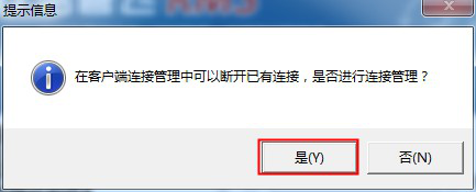 ????出現授權達到最大用戶數提示后,點擊“確定”按鈕,可以看到提示信息“在客戶端連接管理中可以斷開已有連接,是否進行連接管理”,點擊是進入下一選擇,如下圖所示: