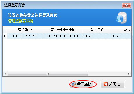 ????點擊“是”,進入管理連接客戶端界面。可以選擇當前登錄的連接,點擊“斷開連接”,可斷開當前已登錄的客戶端程序,然后可以重新登錄。如下圖所示: